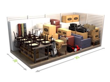 A 10×25 unit provides plenty of space for 3-5 rooms of furniture or office equipment. It is also a great sized unit to store a vehicle while leaving plenty of space around the vehicle to store additional items such as boxes, bicycles, or smaller furniture items.